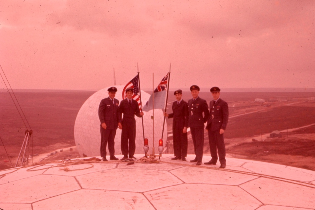 RAF and USAF personnel on top of a newly constructed radome in 1962